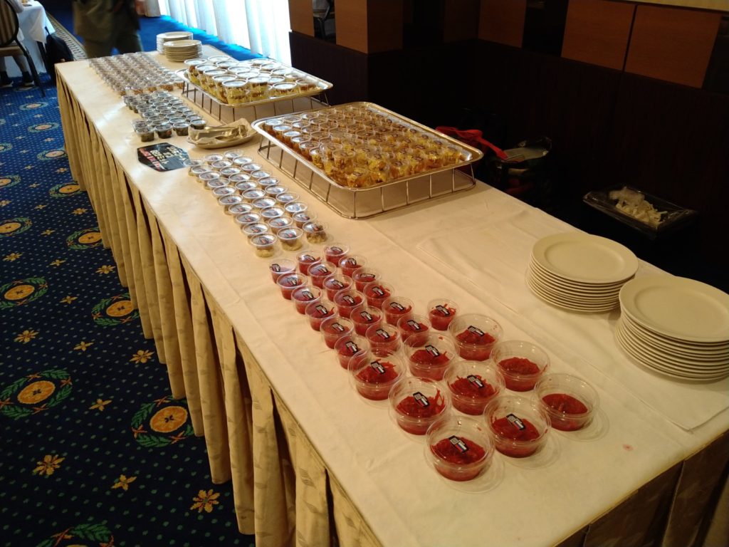 また、講演会途中でティータイムを設け、料理研究家でタレントとしても活躍されている星澤雅也さんに、世界各国の料理を1口サイズにして振る舞っていただき、こちらも大変好評でした。